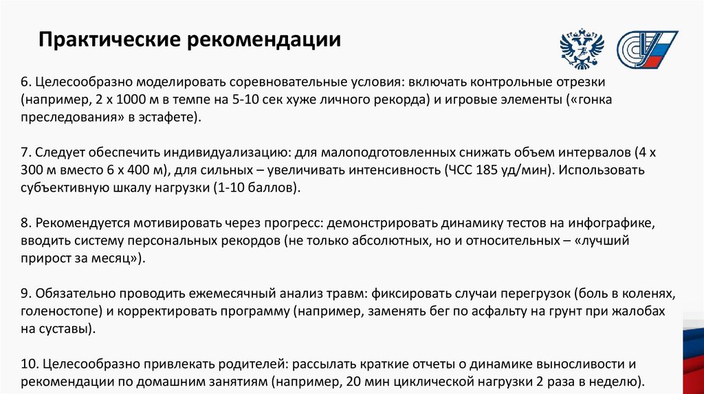 Практические рекомендации6. Целесообразно моделировать соревновательные условия: включать контрольные отрезки