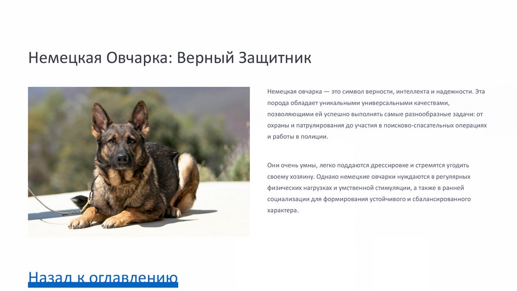 Немецкая Овчарка: Верный ЗащитникНемецкая овчарка — это символ верности, интеллекта и надежности. Эта