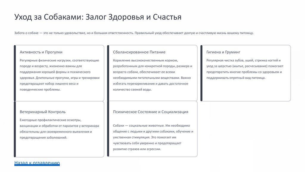 Уход за Собаками: Залог Здоровья и СчастьяЗабота о собаке — это не только удовольствие, но и большая ответственность. Правильный уход обеспечивает долгую и счастливую жизнь вашему питомцу.