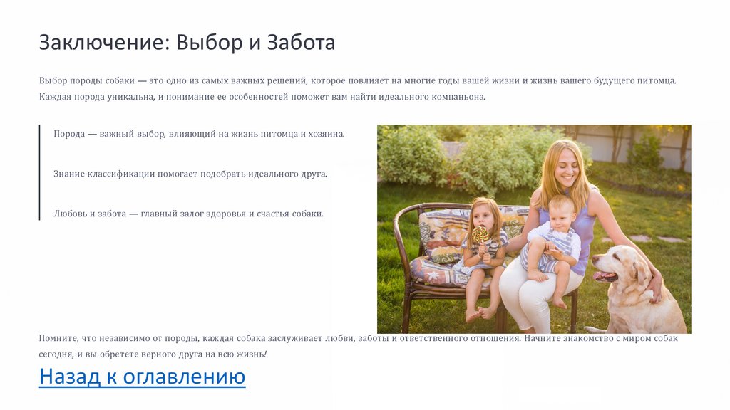 Заключение: Выбор и ЗаботаВыбор породы собаки — это одно из самых важных решений, которое повлияет на многие годы вашей жизни и жизнь вашего будущего питомца.