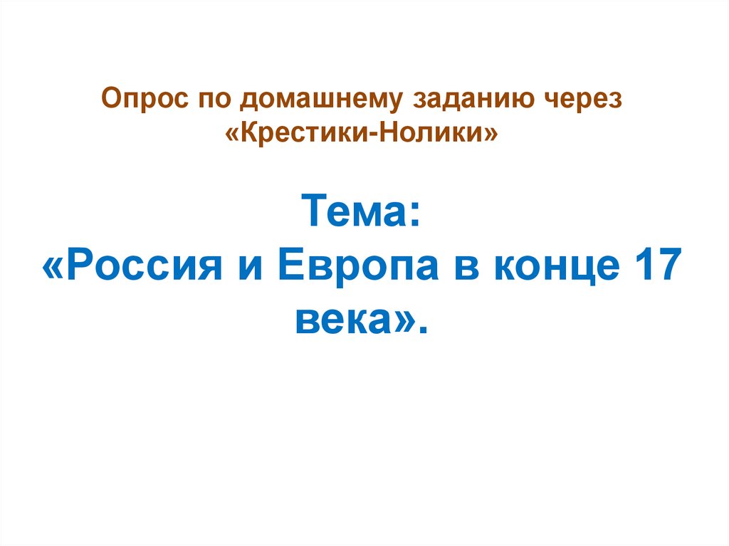 1. Опрос по домашнему заданию через «Крестики-Нолики» Тема: «Россия и Европа в конце 17 века».