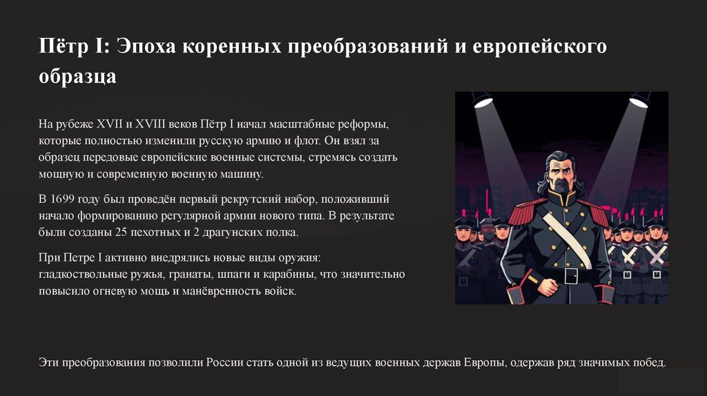 Эти преобразования позволили России стать одной из ведущих военных держав Европы, одержав ряд значимых побед.