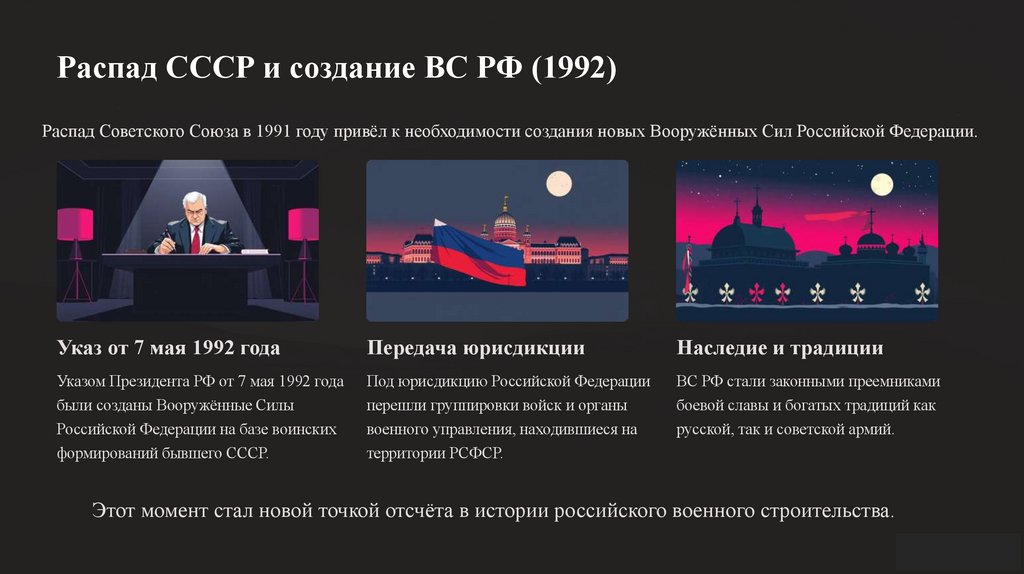 Распад СССР и создание ВС РФ (1992)Распад Советского Союза в 1991 году привёл к необходимости создания новых Вооружённых Сил Российской Федерации.