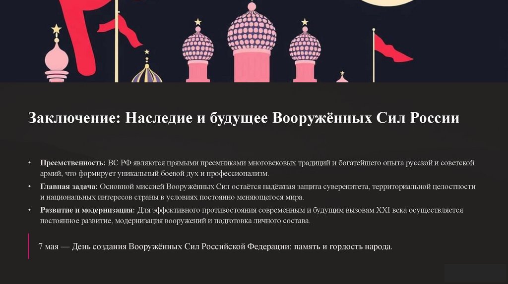 Заключение: Наследие и будущее Вооружённых Сил РоссииПреемственность: ВС РФ являются прямыми преемниками многовековых традиций и богатейшего опыта русской и советской