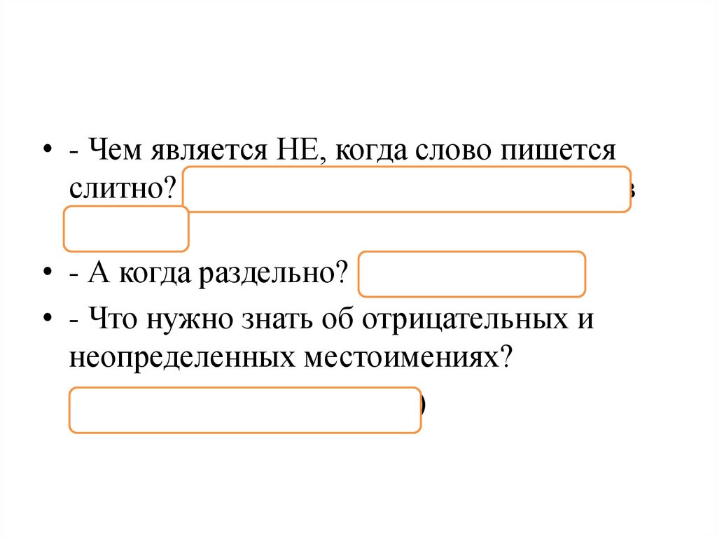 • - Чем является НЕ, когда слово пишетсяслитно? (Приставкой или входит в состав
