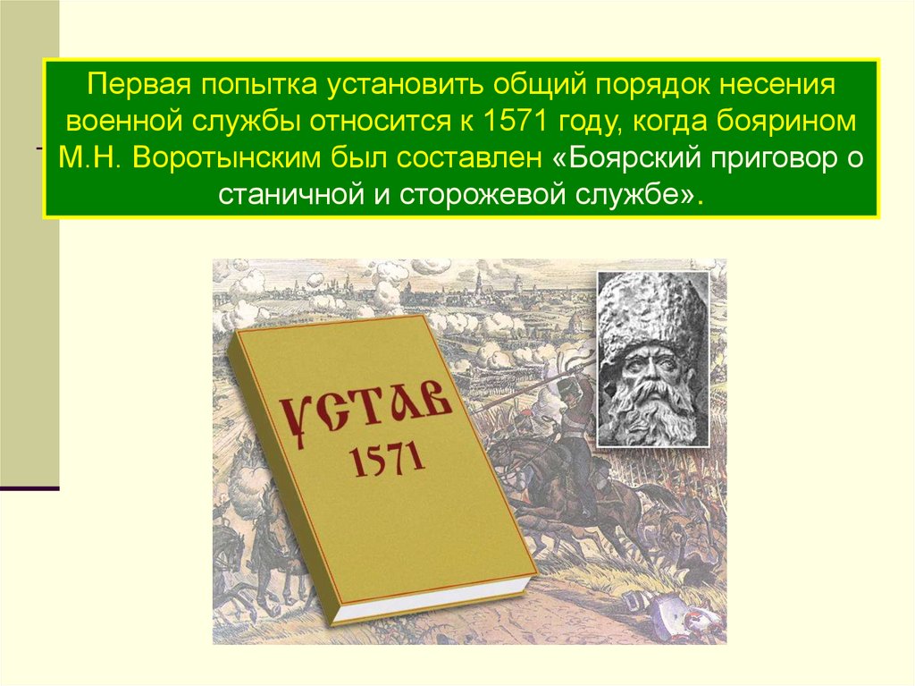Первая попытка установить общий порядок несениявоенной службы относится к 1571 году, когда боярином
