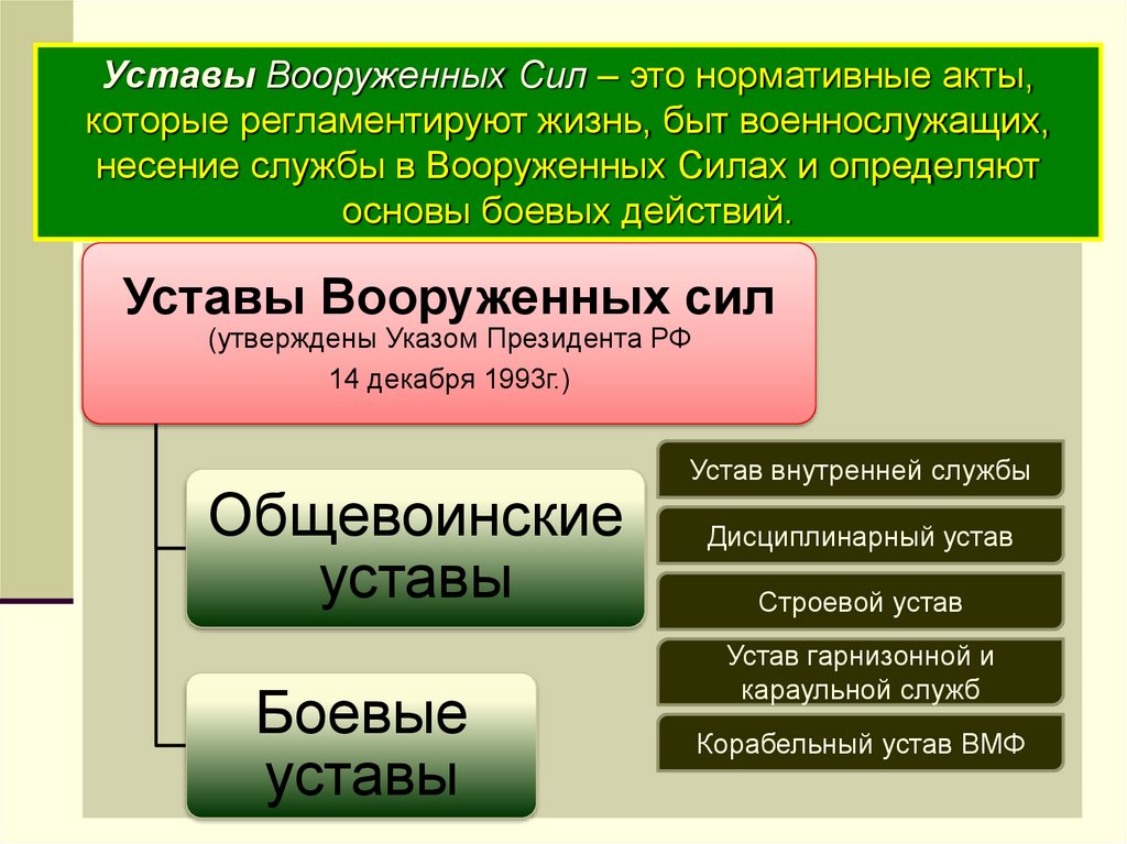 Уставы Вооруженных Сил – это нормативные акты,которые регламентируют жизнь, быт военнослужащих,