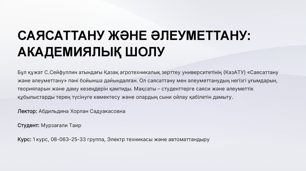 Бұл құжат С.Сейфуллин атындағы Қазақ агротехникалық зерттеу университетінің (КазАТУ) «Саясаттану