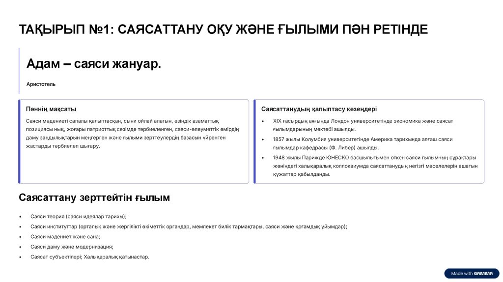 ТАҚЫРЫП №1: САЯСАТТАНУ ОҚУ ЖӘНЕ ҒЫЛЫМИ ПӘН РЕТІНДЕАдам – саяси жануар.