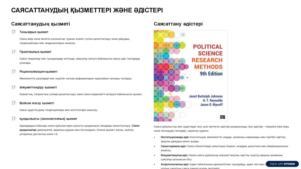 және әлеуметтану» пәні бойынша дайындалған. Ол саясаттану мен әлеуметтанудың негізгі ұғымдарын,