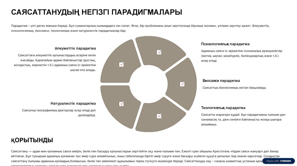 САЯСАТТАНУДЫҢ НЕГІЗГІ ПАРАДИГМАЛАРЫПарадигма – үлгі деген мағына береді. Бұл гуманитарлық ғылымдарға тән сипат. Яғни, бір проблеманы алып зерттегенде бірнеше жолмен, үлгімен зерттеу қажет. Әлеуметтік,