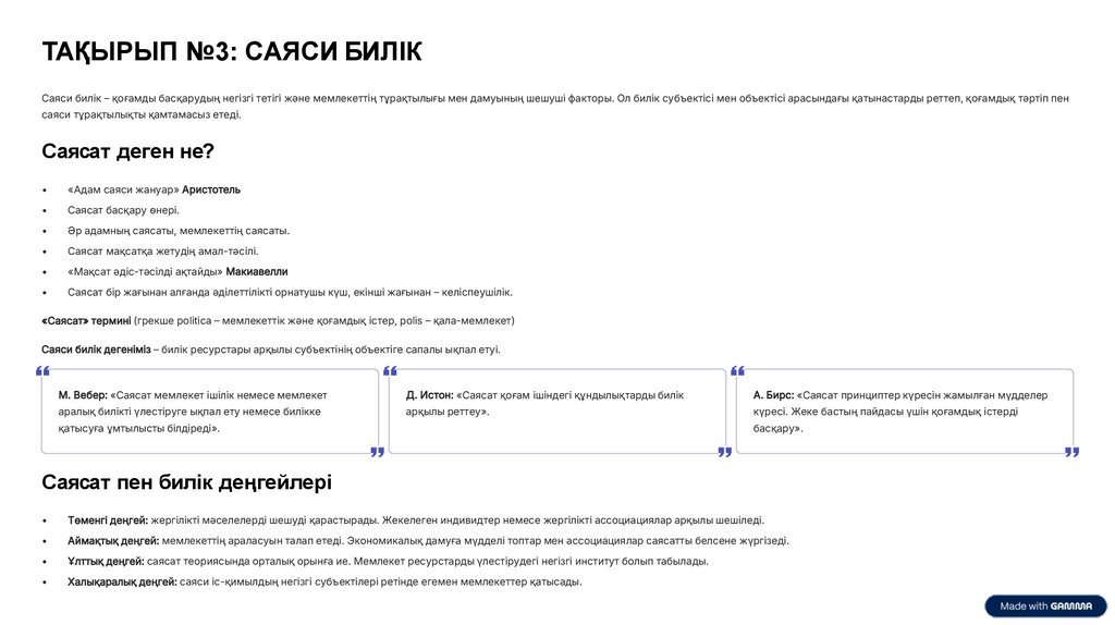 ТАҚЫРЫП №3: САЯСИ БИЛІКСаяси билік – қоғамды басқарудың негізгі тетігі және мемлекеттің тұрақтылығы мен дамуының шешуші факторы. Ол билік субъектісі мен объектісі арасындағы қатынастарды реттеп, қоғамдық тәртіп пен
