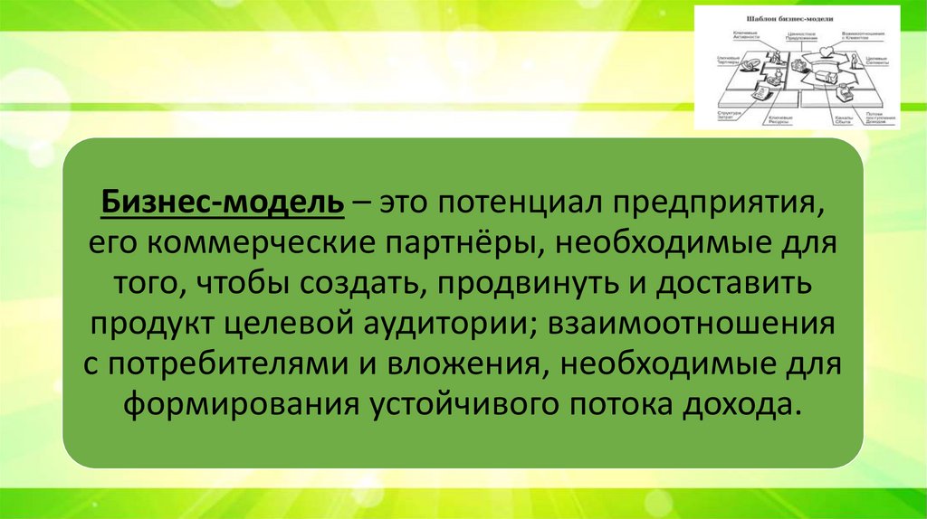 Бизнес-модель – это потенциал предприятия,его коммерческие партнёры, необходимые для