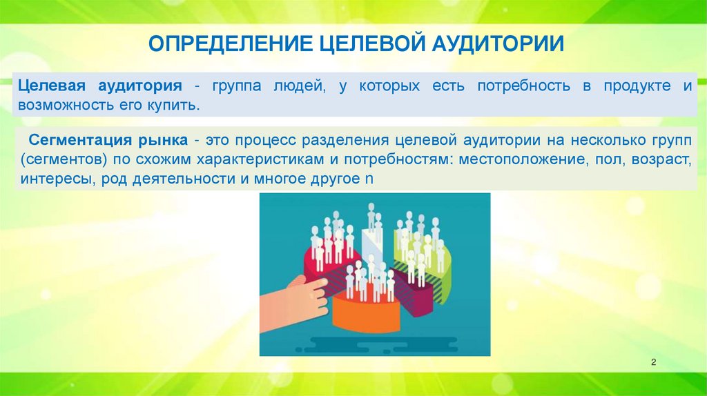 ОПРЕДЕЛЕНИЕ ЦЕЛЕВОЙ АУДИТОРИИЦелевая аудитория - группа людей, у которых есть потребность в продукте и