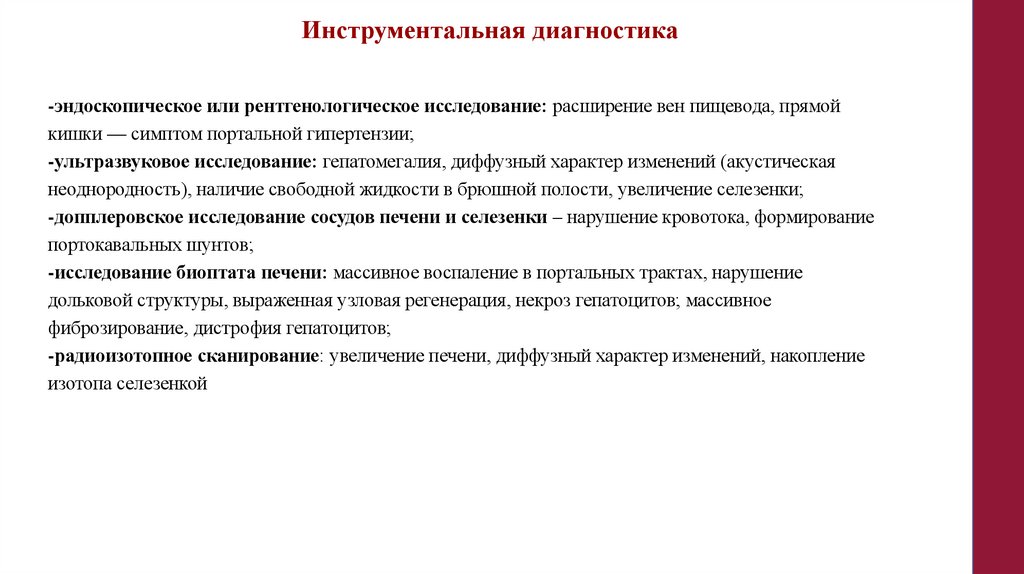 Инструментальная диагностика-эндоскопическое или рентгенологическое исследование: расширение вен пищевода, прямой