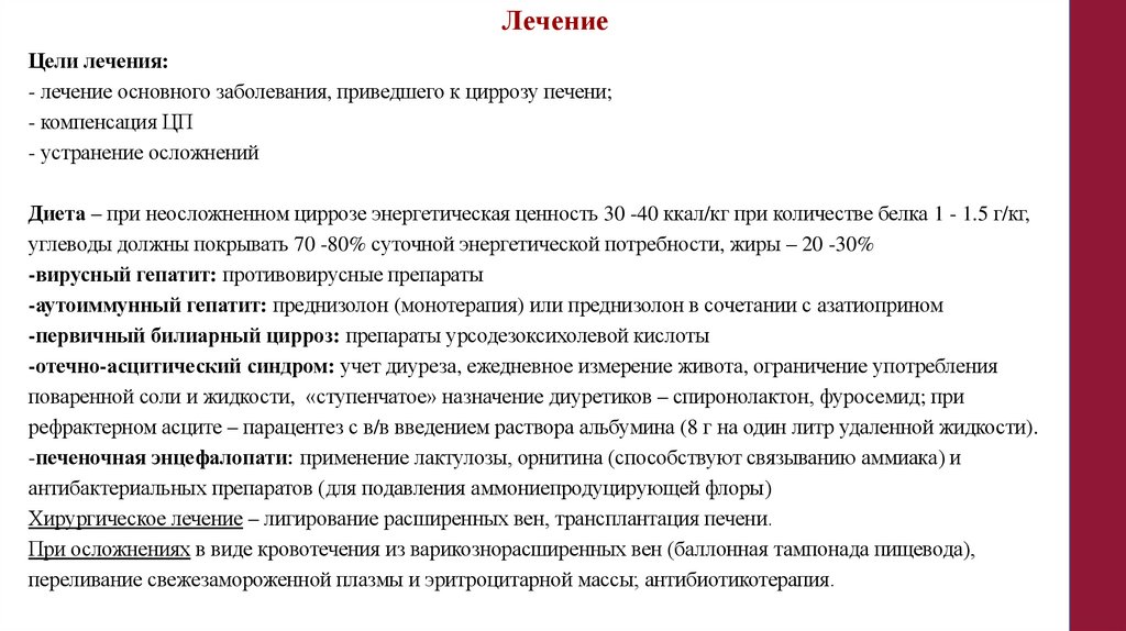 Диета – при неосложненном циррозе энергетическая ценность 30 -40 ккал/кг при количестве белка 1 - 1.5 г/кг,