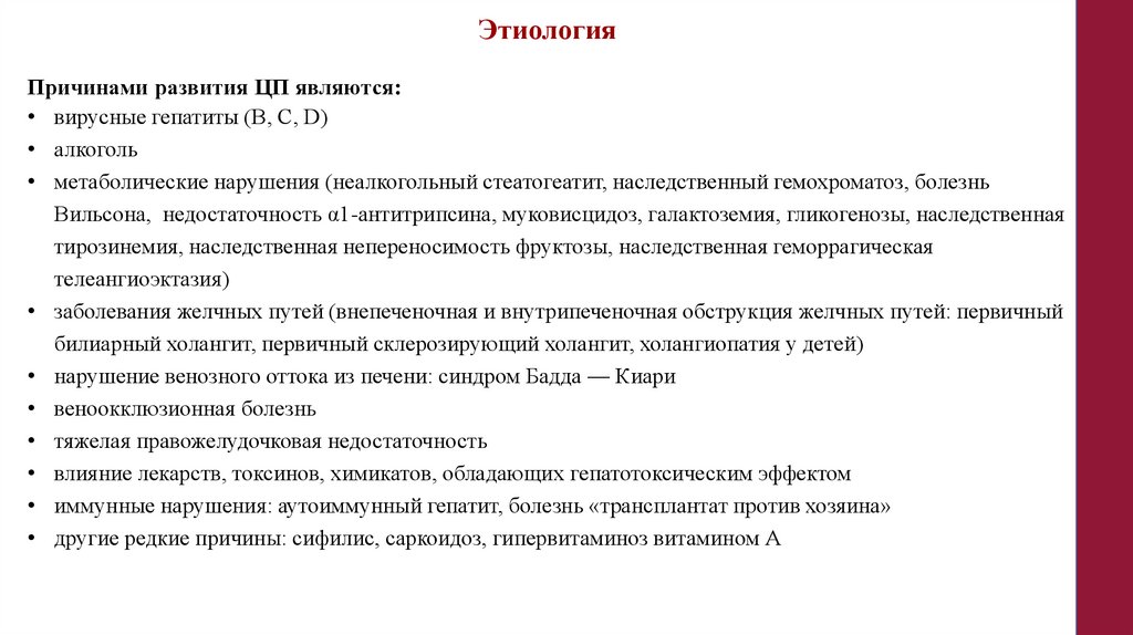 По этиологическому признаку:1)инфекционный (после острого гепатита В, С, B+D, G, ХГ, НГ)