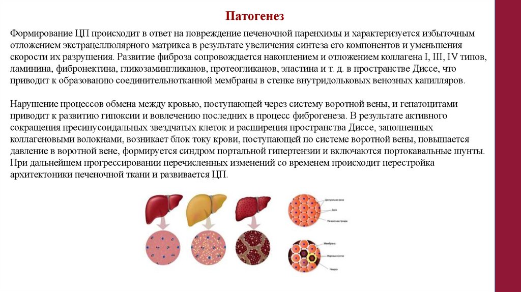 ПатогенезФормирование ЦП происходит в ответ на повреждение печеночной паренхимы и характеризуется избыточным