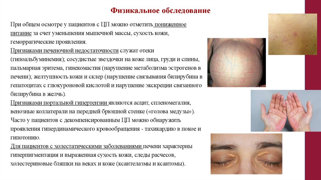 (гипоальбуминемия); сосудистые звездочки на коже лица, груди и спины,