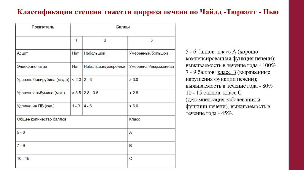 Классификация степени тяжести цирроза печени по Чайлд -Тюркотт - Пью5 - 6 баллов: класс А (хорошо