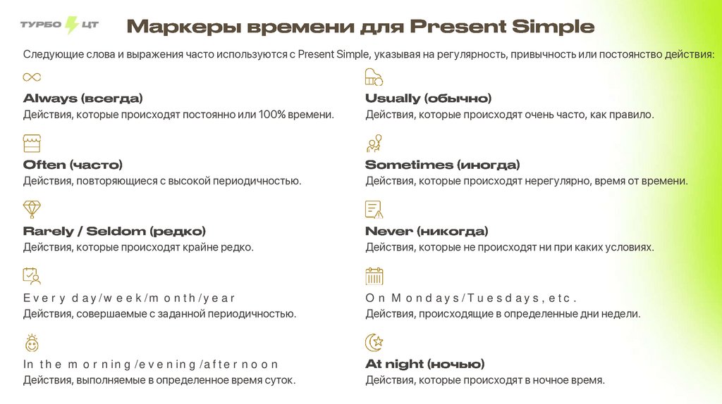 Present SimpleДля постоянных, регулярных действий и фактов. Думайте о расписаниях и привычках.