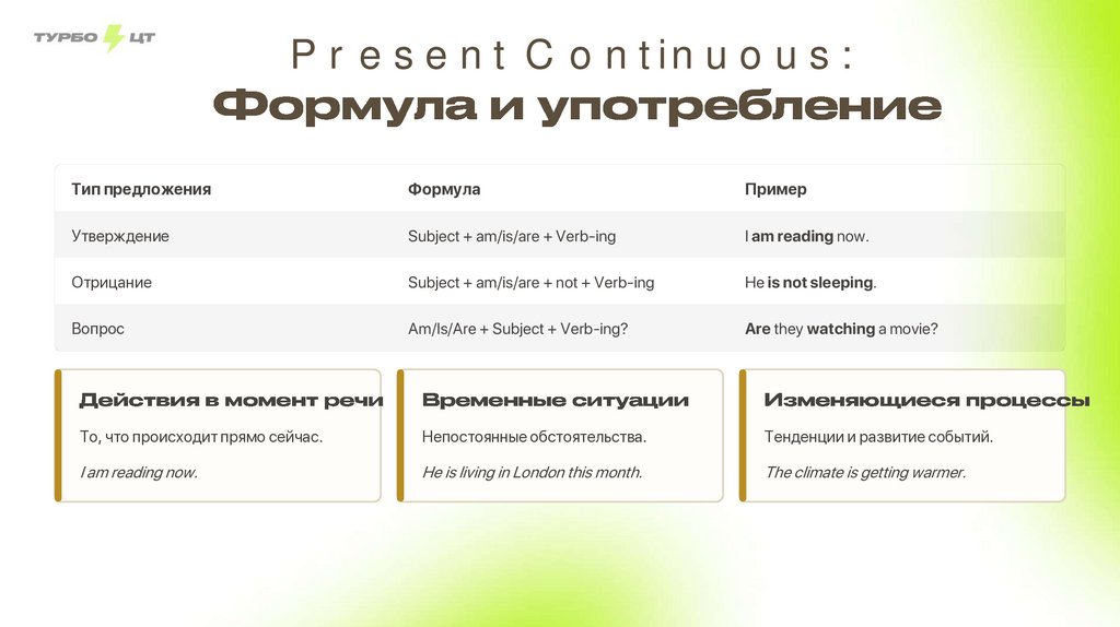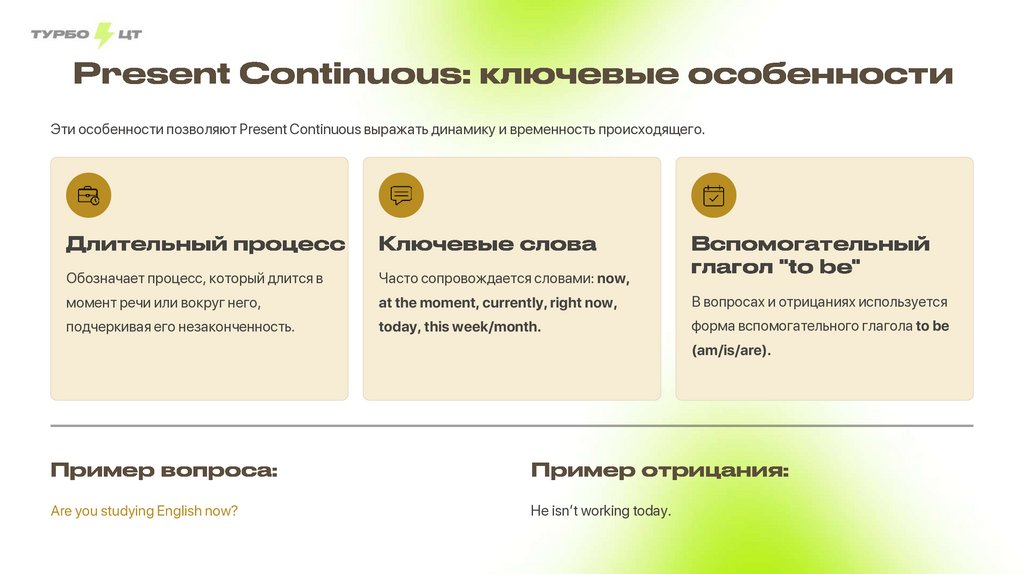Эти особенности позволяют Present Continuous выражать динамику и временность происходящего.Обозначает процесс, который длится в