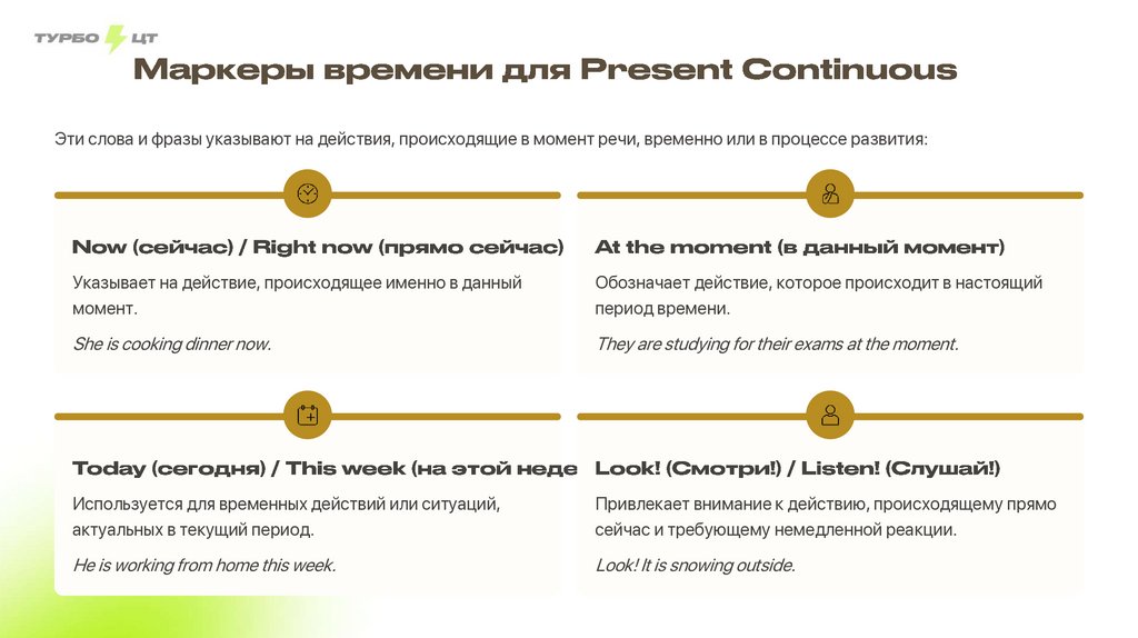 Эти слова и фразы указывают на действия, происходящие в момент речи, временно или в процессе развития:Указывает на действие, происходящее именно в данный