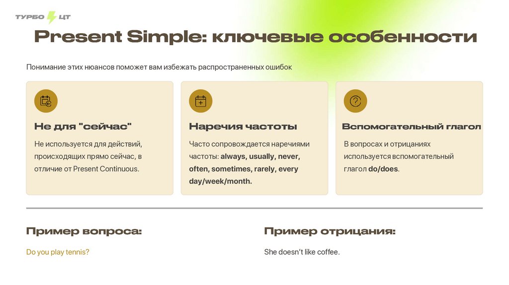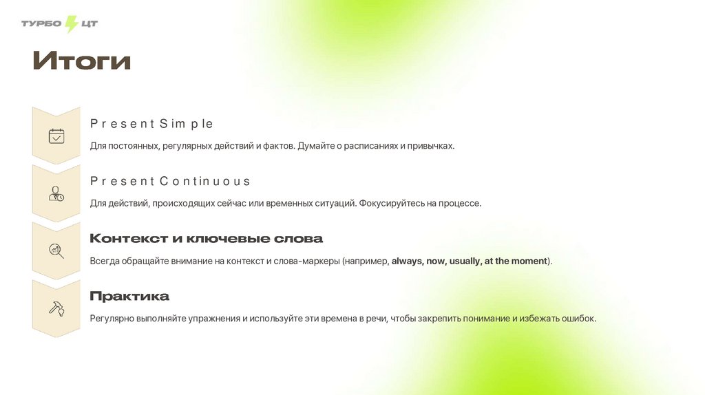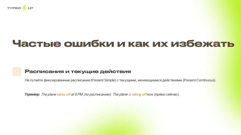 Не путайте фиксированные расписания (Present Simple) с текущими, меняющимися действиями (Present Continuous).Пример: The plane takes off at 6 PM (по расписанию). The plane is taking off now (прямо сейчас).
