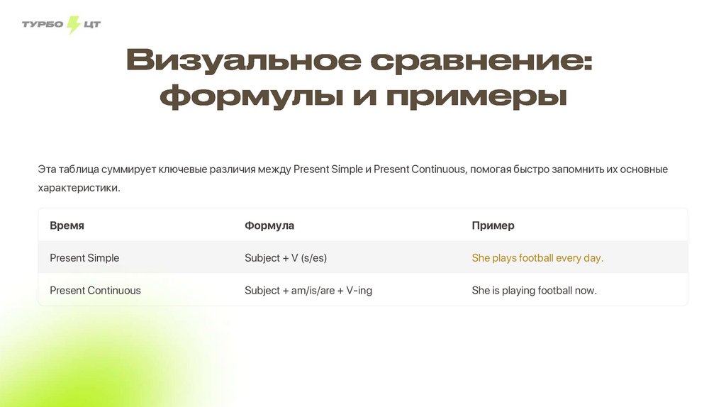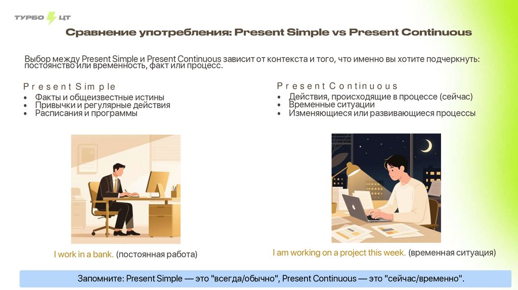 Эта таблица суммирует ключевые различия между Present Simple и Present Continuous, помогая быстро запомнить их основныехарактеристики.