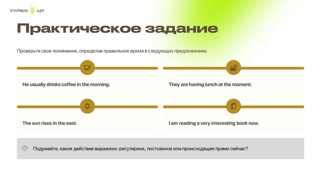 Проверьте свое понимание, определив правильное время в следующих предложениях.He usually drinks coffee in the morning.