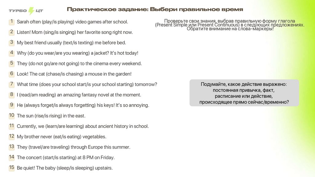 Всегда обращайте внимание на контекст и слова-маркеры (например, always, now, usually, at the moment).