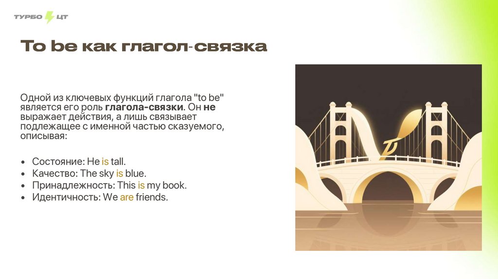 Одной из ключевых функций глагола "to be"является его роль глагола-связки. Он не
