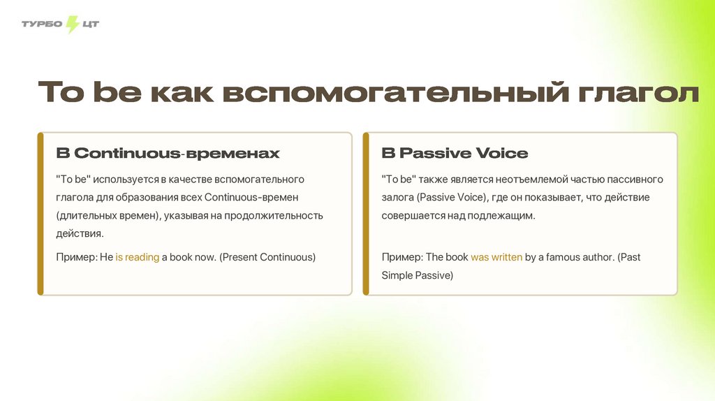 "To be" используется в качестве вспомогательного"To be" также является неотъемлемой частью пассивного