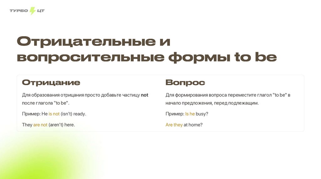 Для образования отрицания просто добавьте частицу notДля формирования вопроса переместите глагол "to be" в