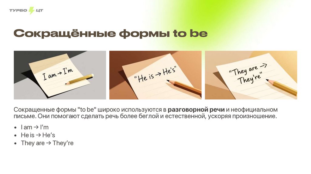 Сокращенные формы "to be" широко используются в разговорной речи и неофициальномписьме. Они помогают сделать речь более беглой и естественной, ускоряя произношение.