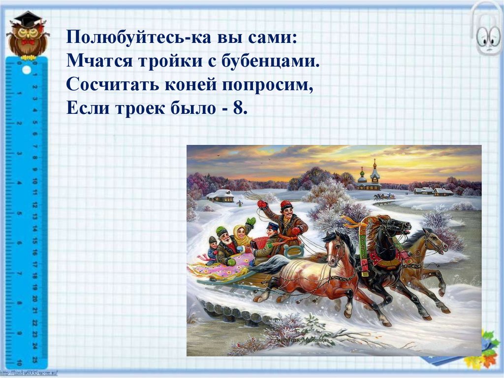 Полюбуйтесь-ка вы сами:Мчатся тройки с бубенцами.