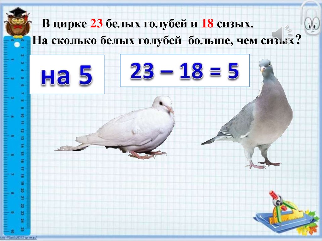 В цирке 23 белых голубей и 18 сизых.На сколько белых голубей больше, чем сизых?
