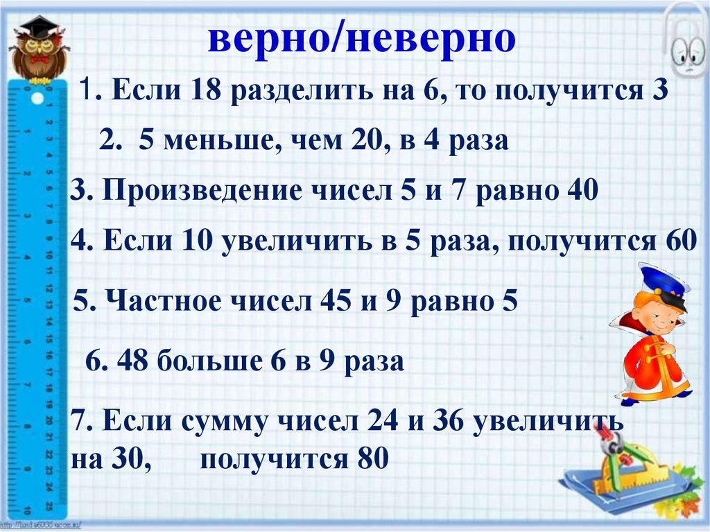 верно/неверно1. Если 18 разделить на 6, то получится 3
