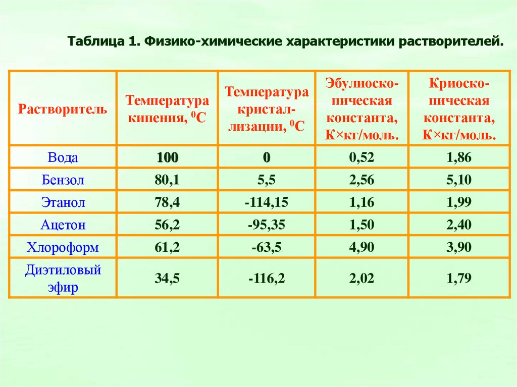Таблица 1. Физико-химические характеристики растворителей.Эбулиоскопическая