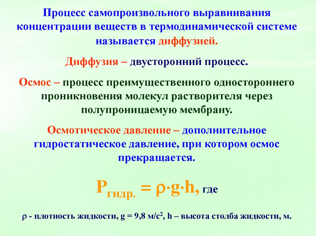 Процесс самопроизвольного выравниванияконцентрации веществ в термодинамической системе