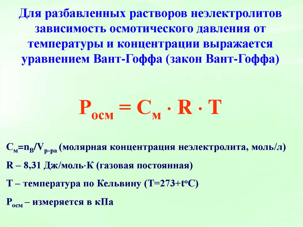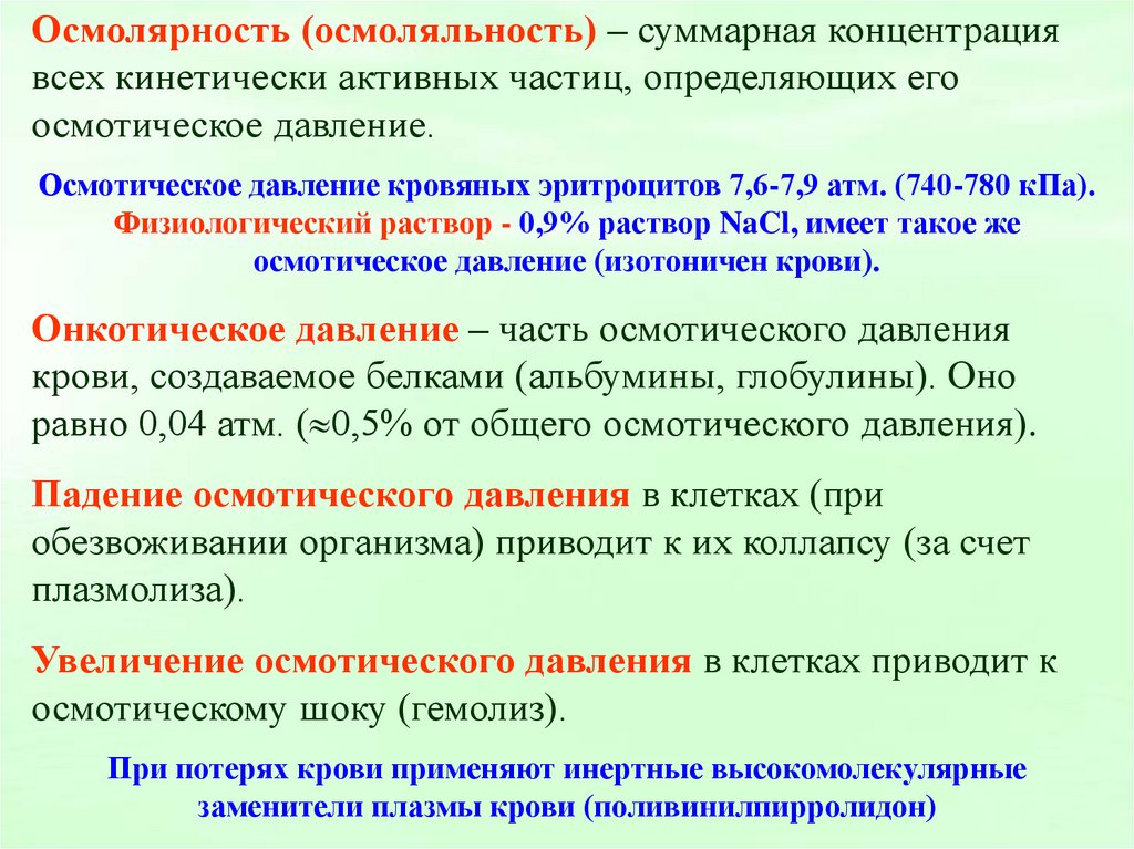 Осмолярность (осмоляльность) – суммарная концентрациявсех кинетически активных частиц, определяющих его
