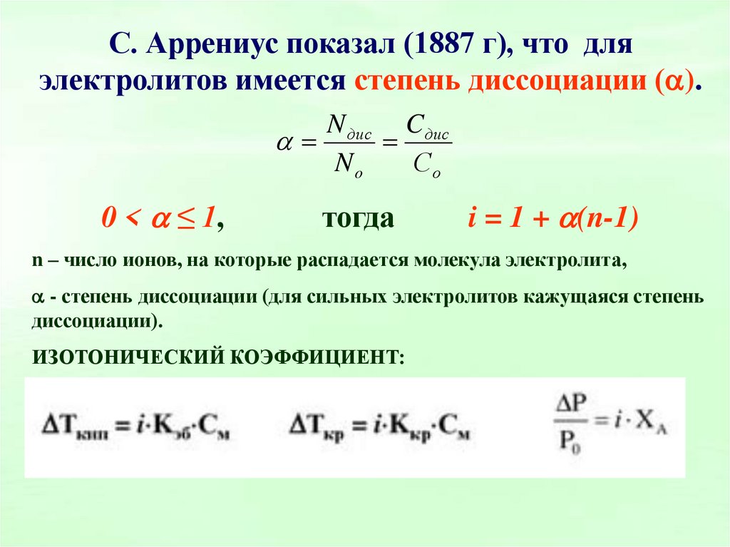 С. Аррениус показал (1887 г), что дляэлектролитов имеется степень диссоциации ( ).