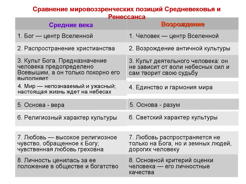 Сравнение мировоззренческих позиций Средневековья иРенессанса