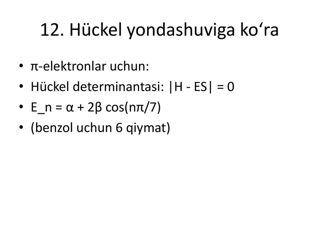 12. Hückel yondashuviga ko‘ra• π-elektronlar uchun: