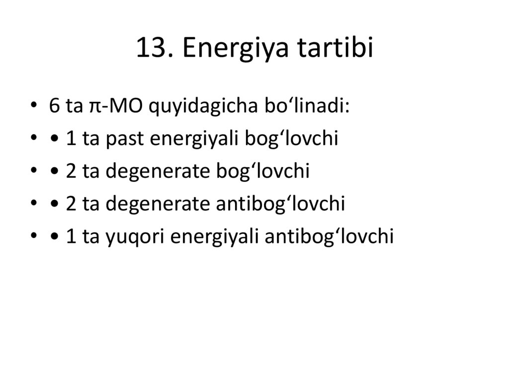 13. Energiya tartibi• 6 ta π-MO quyidagicha bo‘linadi: