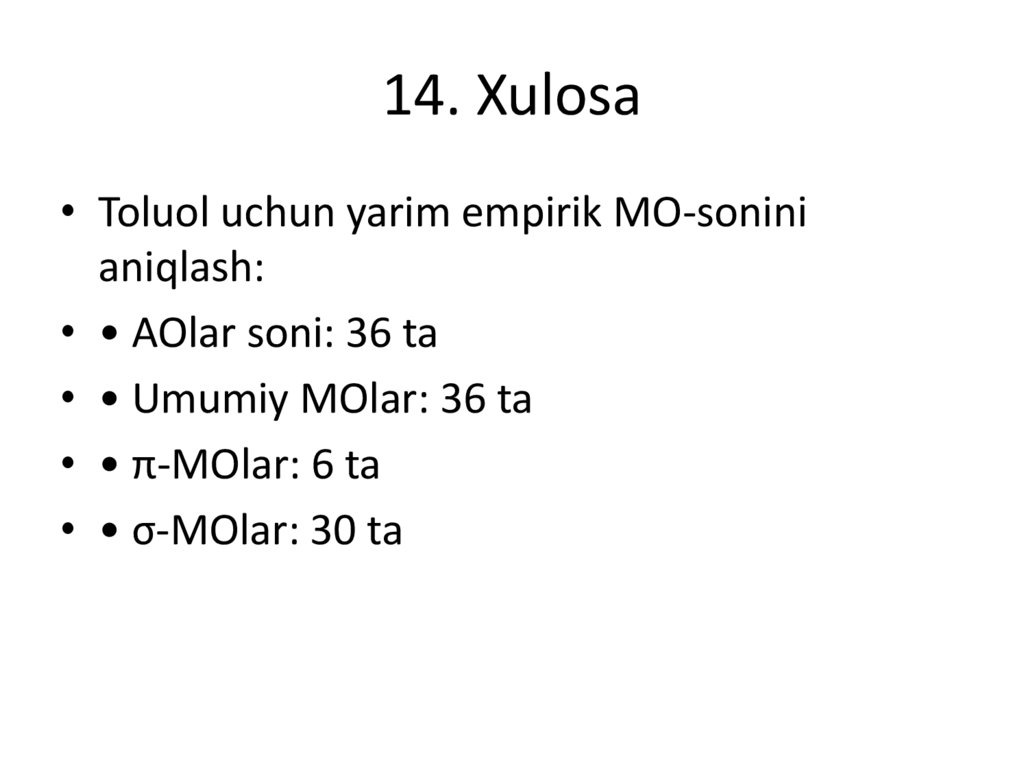 14. Xulosa• Toluol uchun yarim empirik MO-sonini
