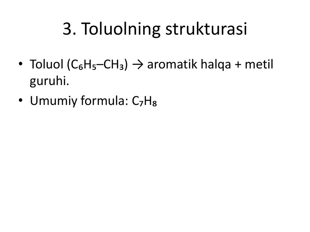 3. Toluolning strukturasi• Toluol (C₆H₅–CH₃) → aromatik halqa + metil
