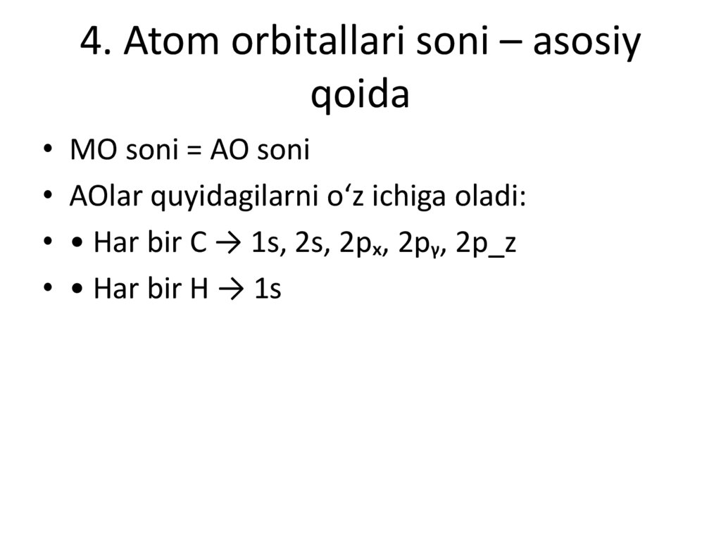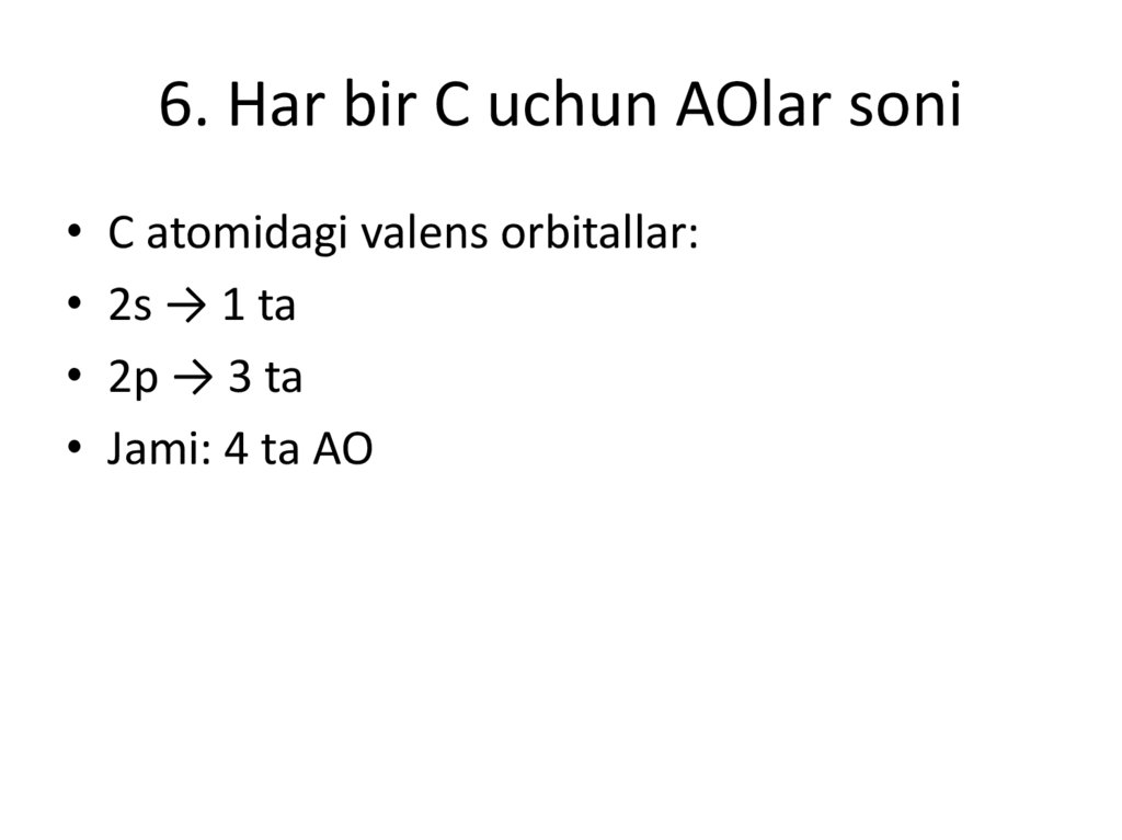 6. Har bir C uchun AOlar soni• C atomidagi valens orbitallar: