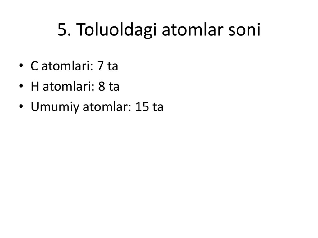 5. Toluoldagi atomlar soni• C atomlari: 7 ta