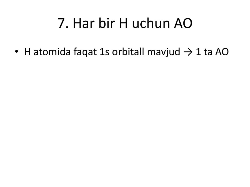 7. Har bir H uchun AO• H atomida faqat 1s orbitall mavjud → 1 ta AO